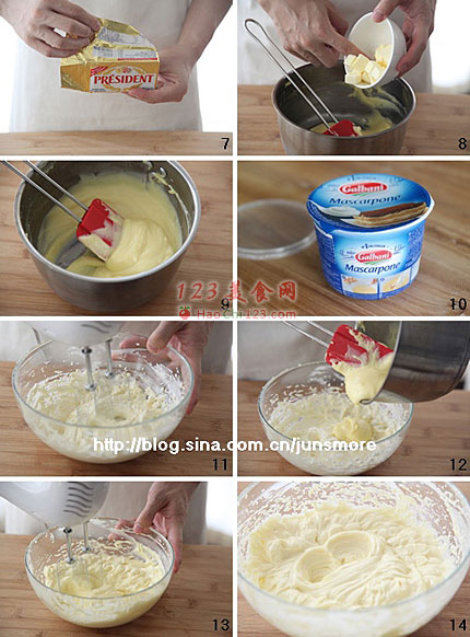 10、接着准备搅打芝士。制作这款蛋糕,使用了一半奶油芝士加一半马斯卡彭芝士,达到更细腻的口感。马斯卡彭芝士是一种口感非常清爽柔软的芝士,英文名为mascarpone,也就是做提拉米苏的芝士哈(图中为Galbani的马斯卡彭芝士,也是我最喜欢的一款马斯卡彭芝士)。