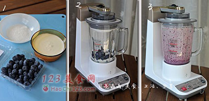 2、蓝莓放入料理机,倒入一半的酸奶和一半的细砂糖。