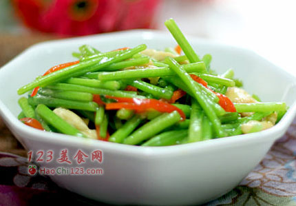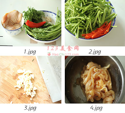 2、3、茼蒿去叶切5厘米左右小段,红椒切丝,蒜切末。