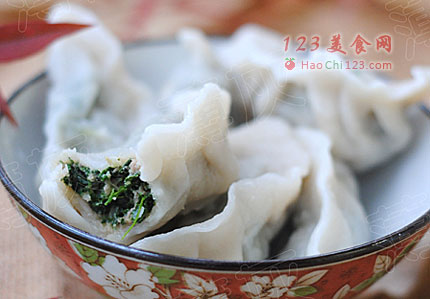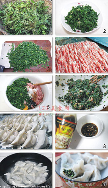 3、4、荠菜切碎待用。猪肉切成肉末待用(三分肥七分瘦)。