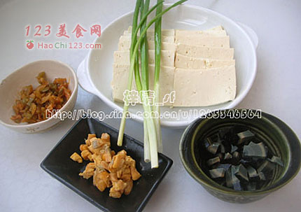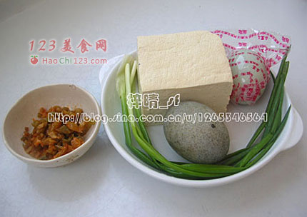 2、将皮蛋粒、咸蛋粒、榨菜粒、虾米、葱花撒在豆腐上。