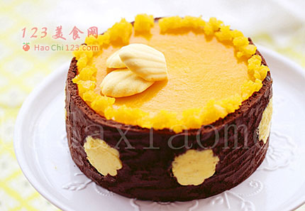 17、取少量芒果慕斯倒入模具中(花朵镂空的地方一定要先填满),快速冷冻10分钟后放入脱模的巧克力慕斯,挤入剩余芒果慕斯,冷藏过夜。