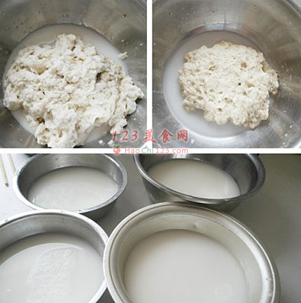 5、把几个盆里沉淀好的面粉里的水倒出去后全部混合一起搅拌均匀的面粉糊。