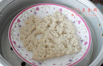 3、洗好的面最后水是清的,完全没有白色的面粉了,全是面筋了,嘿嘿,将洗好的面筋摊平入锅蒸8分钟左右至熟取出待凉备用。