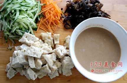 4、调料准备:糖、芝麻酱、辣椒油、骨汤、酱油、陈醋、胡萝卜、木耳、黄瓜、大蒜。将大蒜制成蒜泥,用糖、芝麻酱、骨汤、酱油、陈醋调好拌酱备用,面筋切适当大小块,黄瓜、胡萝卜、木耳切丝备用。