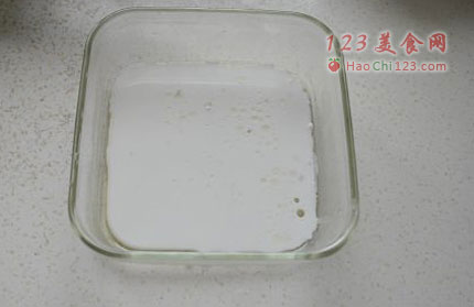 6、取一个微波炉适用的容器,底部刷一层油后将面粉糊倒入少许薄薄的一层即可。