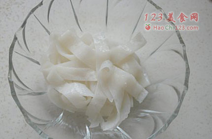7、放到微波炉里加热40秒取出即成就一张凉皮,依次重复8的操作将所以面粉糊做面凉皮后切成手指粗细的凉皮条。