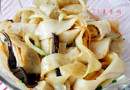 3、凉皮是一款风靡街头的小吃,夏天吃起来挺清新凉爽的,不热。据说在陕西还有烙面皮、魔芋凉皮、黑米凉皮,绿豆凉皮好多种凉皮。面筋凉皮主产于关中地区,要先洗出面筋,淀粉调成糊,盛入金属凉皮箩上锅蒸制。调制时,加入蒸烹面筋块、时令蔬菜,调味品有醋、酱、蒜汁、味精、盐、辣椒油、香油等,吃时别有风味。[sushi.laoyanhuo.com]