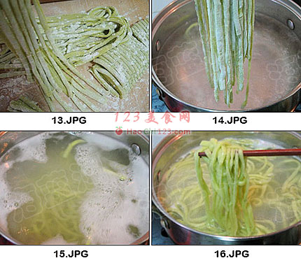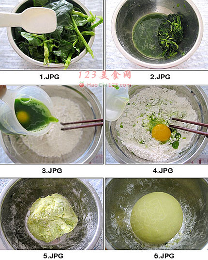 3、将鸡蛋与菠菜汁的混合液加入到面粉里。