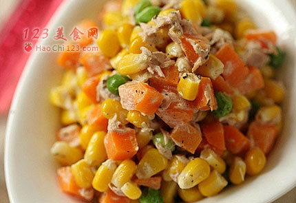 2、把煮好的玉米蔬菜粒放到大碗里面,再放上金枪鱼碎撒上沙拉酱拌匀就可以享用了。