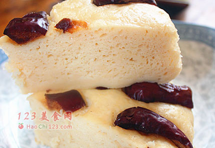 6、小蒸笼放上笼屉布,倒上所有的面糊,摆上一层大枣,放入烧开的蒸锅里,中火蒸30分钟左右。