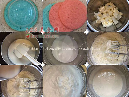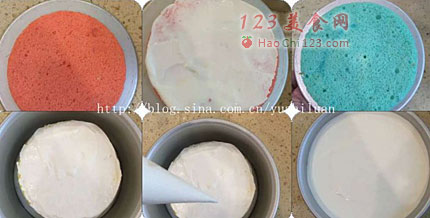 12、将红色蛋糕片放蛋糕模底部,抹一层奶酪糊,盖上一片蓝色蛋糕片,在抹奶酪糊,然后放红色蛋糕片,奶酪糊,依次类推,蛋糕片放完。