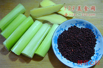 5、准备好葱姜;红曲米给猪肉上色(500克肉,5克红曲米)。