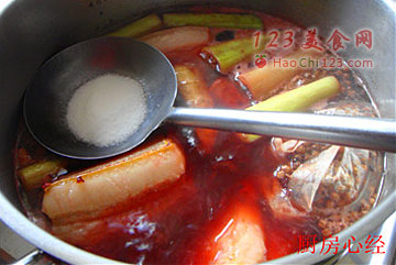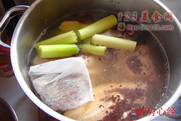 6、撇去浮沫后,放入葱姜;红曲米,炖肉料包;料酒。大约煮30分钟。这样可以煮去肉块的许多油脂。红曲米解腻增香。还能够保持肉块的天然红色。