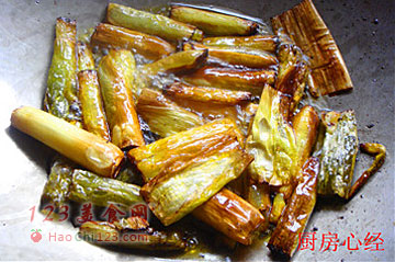 9、将准备好的大葱,切成段。下油锅,将大葱炸成金黄色备用。