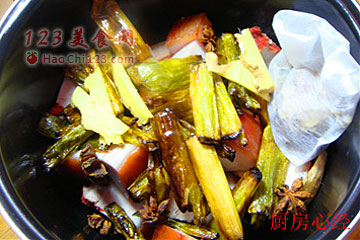 10、将肉块;炸好的大葱;炖肉料包放入压力锅内胆中,肉块可以增加诱人的葱香。