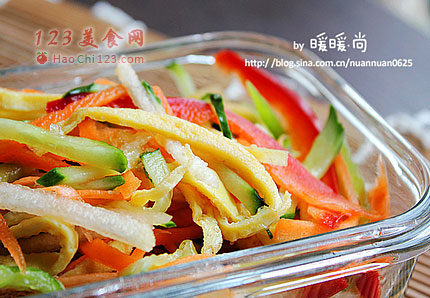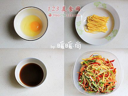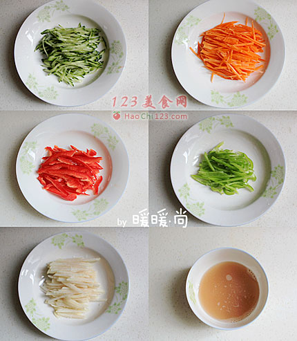 3、青红椒各半个切丝,如果你吃不惯生的青红椒可以烫一下。