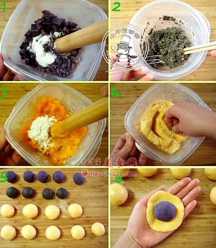 5、紫薯馅、黑芝麻馅、南瓜团各分成相同数量的等份。