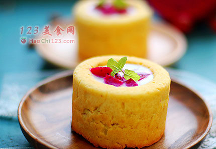 8、烤箱提前预热至160度,将模具放入烤箱中层,上下火考30分钟,烤好后取出晾凉,盛上酸奶,码放上切好的红心火龙果,点缀柠檬叶即可。