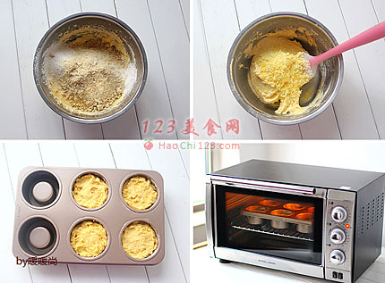 7、模具提前刷油撒上干粉防粘,把拌好的面糊装入裱花袋,然后计入模具中。