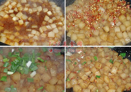 3、加水(最好是开水)没过萝卜丁,盖上锅盖,小火焖至水分不多的时候,加干椒末炒匀。