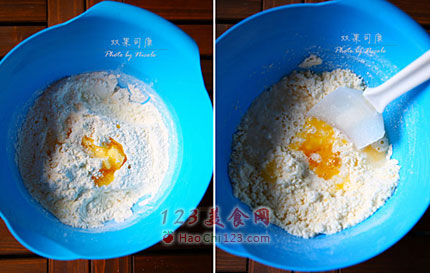 1、在过筛的粉类中加入糖和软化的黄油,搓至黄油与面粉完全混合均匀。