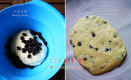 3、倒入樱桃干和蓝莓干,轻揉,使面团裹住果干。
