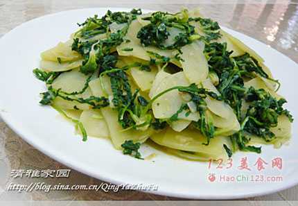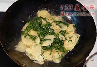 4、等土豆片断生后,放入荠菜,加盐烧入味,最后放鸡精收汁即可。