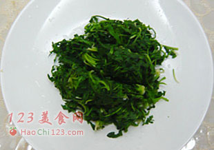 2、荠菜择洗干净,放在开水里,等水再次滚开就捞出,切段。