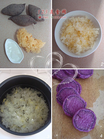 8、雪耳煮至汤汁粘稠时,将紫薯块和冰糖倒入煮5-8分钟。