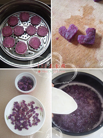 4、紫薯蒸至微软即可,蒸得太久散了就不容易切成心型。