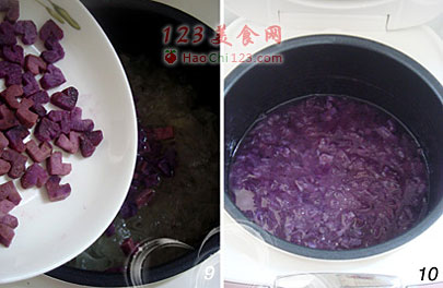 9、10、紫薯块煮软后,再倒入心紫薯煮3-5分钟即可开吃,或是放入冰箱1小时后冰着吃。