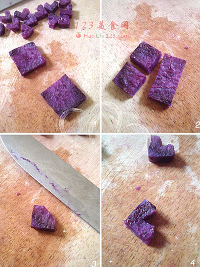 1、将蒸过的紫薯片切成正方形。