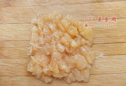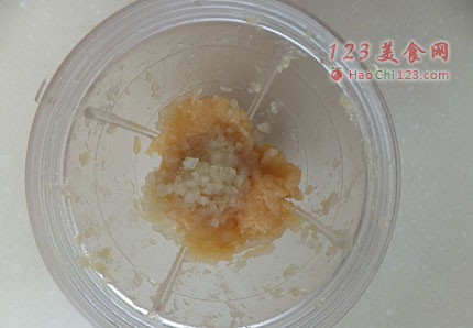 3、加入姜汁、盐抓匀,再加入蚝油和剁碎的洋葱末拌匀。加入淀粉拌匀。