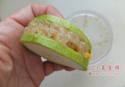 5、西葫芦切成厚片,再将厚片从中间切一刀,可不用切断。用筷子将肉馅填进切好的西葫芦夹。