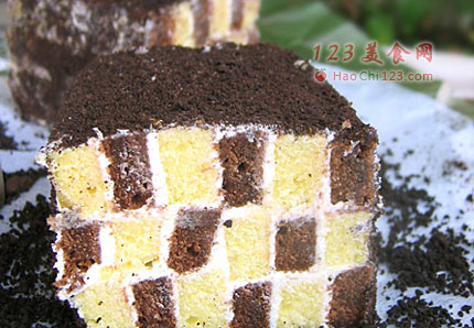 二、棋格子奶油蛋糕的大概制作流程:先做两种颜色的蛋糕片-->分割同样大小的形状-->再涂奶油霜,错落拼好-->外裹蛋糕屑或者饼干屑即成。