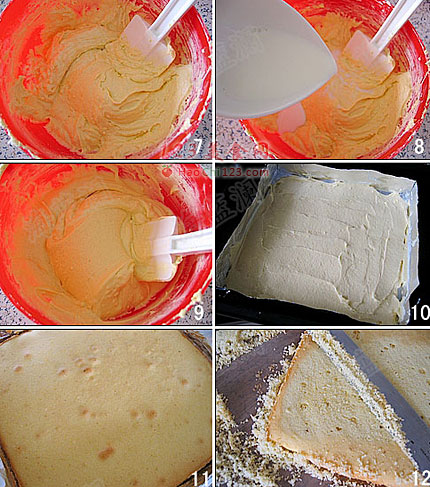 11、把烤盘放进预热好170度的烤箱,烤12分钟左右,直到充分膨胀,表面微金黄色。取出冷却,原味的蛋糕片就烤好了。
