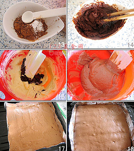 18、放入预热至170度的烤箱,烤12分钟左右。取出冷却后,巧克力味蛋糕片就烤好了。
