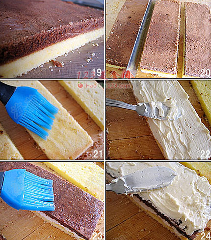 28、切好以后,可以得到三片颜色为“黑-黄-黑”的蛋糕片和三片颜色为“黄-黑-黄”的蛋糕片。取一片蛋糕片,刷上朗姆酒糖浆,涂上奶油霜。