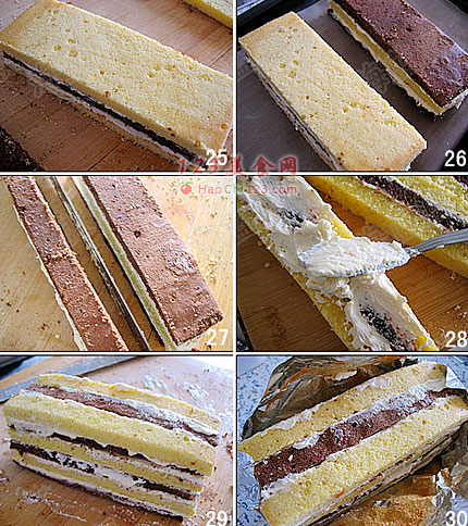 26、反过来上面的堆叠顺序,又可以做好一条蛋糕。把两条蛋糕都放进冰箱冷冻10分钟左右,直到奶油霜变硬。