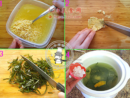 4、陈皮泡软后,里面的白色内膜要刮干净,以防味苦,放陈皮味道比较香,有助于食物的消化,具有健脾、燥湿化痰、解腻留香、降逆止呕的功效。但是不要多,一小块就好。