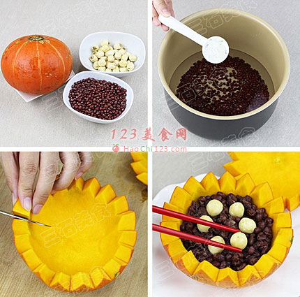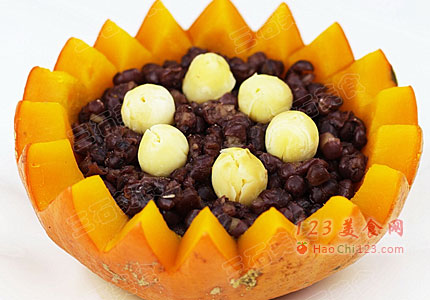 3、将煮好的红豆和莲子捞出,沥干汤汁,放入南瓜瓜盅内,再放入蒸锅,开锅后蒸15分钟即可。