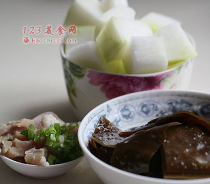 1、冬瓜去皮洗净,切块,咸肉洗净切片,海带泡发后洗净,切条。
