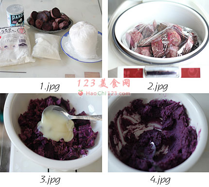 3、4、蒸好的紫薯去皮,放适量炼乳,碾碎,搅拌成紫薯馅。