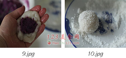 9、手上沾水,揪一块蒸好的糯米滋皮,包入紫薯馅。