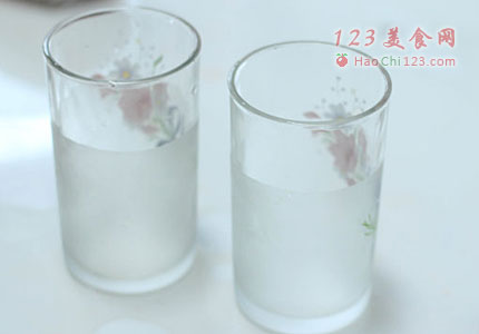 5、揭晓小窍门:很简单,如下图两个上下一般粗的透明水杯,这样一个杯子放满糯米粉,另外一个杯子放五分之一的澄粉就可以了,当然这个简易的小窍门只适合可以用量不是那么精确的小点心,不适合做西点这样需要用量特精确的东东哦。
