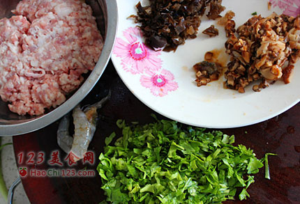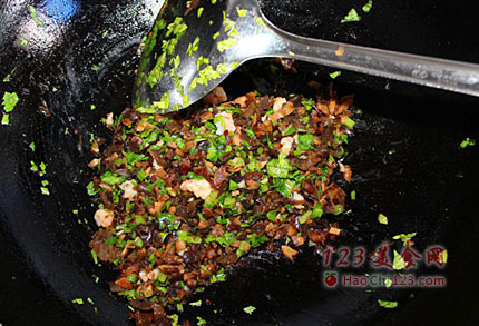 3、锅里放少许油,先放入肉糜翻炒,我加的是豆瓣酱,然后再把其他的原料放入,翻炒几下至肉糜熟了即可。