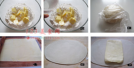 1、黄油片软化很快,在操作过程中需要不断的放入冰箱冷藏,使黄油稍变硬后再进行操作,如果面团不易擀开或黄油软化漏油,则必须先把面团放入冰箱冷藏再操作。