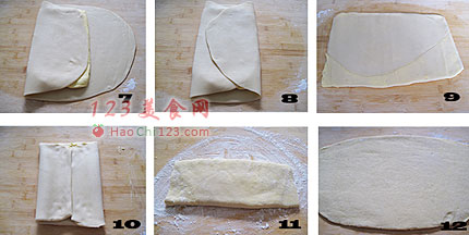 12、取出松弛好的面片,重复9—11步,再进行两轮面片4折,全程共3轮。完成三轮4折后,把面片擀成厚度约0.3厘米的长方形,千层酥皮就做好了。