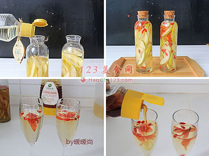 7、取适量的果醋过滤一下果肉残渣,按照果醋矿泉水1:25的比例稀释,再加几颗枸杞和百合花点缀。